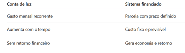 Ao invés de pagar mensalmente uma conta de luz que só aumenta, você passa a investir em um sistema que gera sua própria energia, traz economia imediata e valoriza seu imóvel.